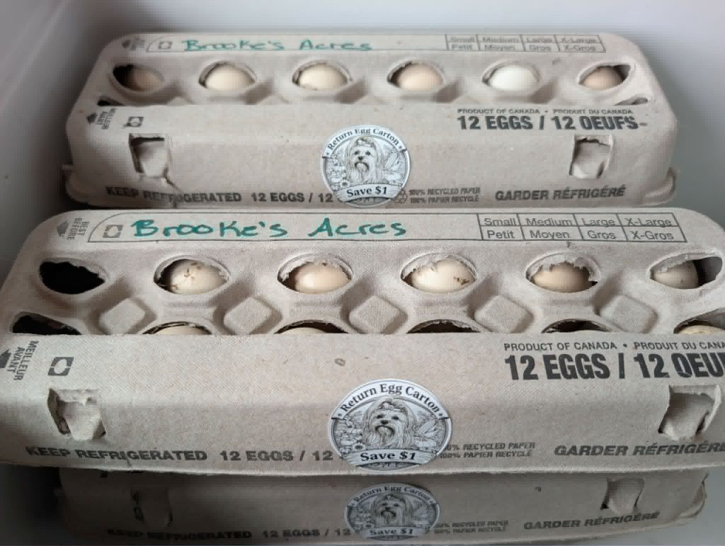 Also for a limited time, when you bring back your Brooke’s Acres egg carton you save $1 on your next purchase of eggs.